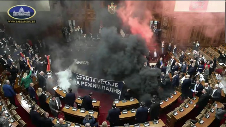 Belgrad (AFP) – Serbian opposition lawmakers light flares and discharge suspected tear gas during the opening day of the spring session of parliament in a sign of support for ongoing anti-corruption protests. Serbia has been rocked for months by student-led protests following the collapse of a train station roof last year that killed 15 people and ignited long-simmering anger in the country over corruption and the alleged lack of oversight for construction and development projects.