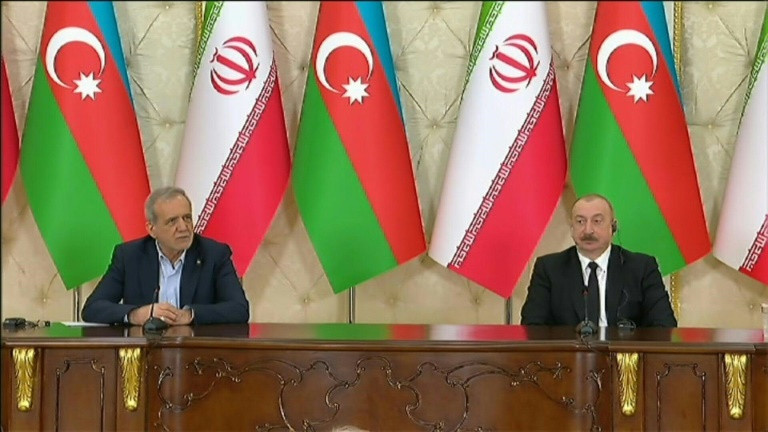 Baku (AFP) – Iranian President Masoud Pezeshkian meets with his Azerbaijani counterpart in a rare visit to Baku, the latest sign of a thaw in relations between the two neighbours. During the meeting Pezeshkian says that Iran sees the region of Karabakh as “an inseparable part of Azerbaijan.” Over the past four decades Azerbaijan has fought two wars with Armenia over the mountainous region of Karabakh. Azerbaijan seized the entire area in a 24-hour offensive in September 2023.