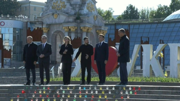 Kiew (AFP) – French President Emmanuel Macron, German Chancellor Friedrich Merz, British Prime Minister Keir Starmer and Polish Prime Minister Donald Tusk join Ukrainian President Volodymyr Zelensky and First Lady Olena Zelenska in laying candles at the National Memorial to the Fallen Defenders of Ukraine.